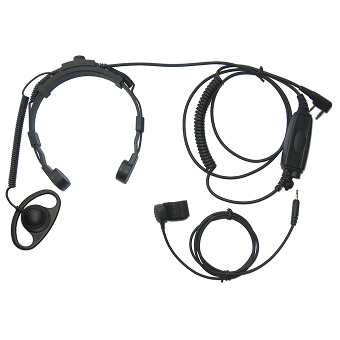 Heavy deaty throat microphone with double PTT, finger PTT available, and D shape ear hanger earpiece.